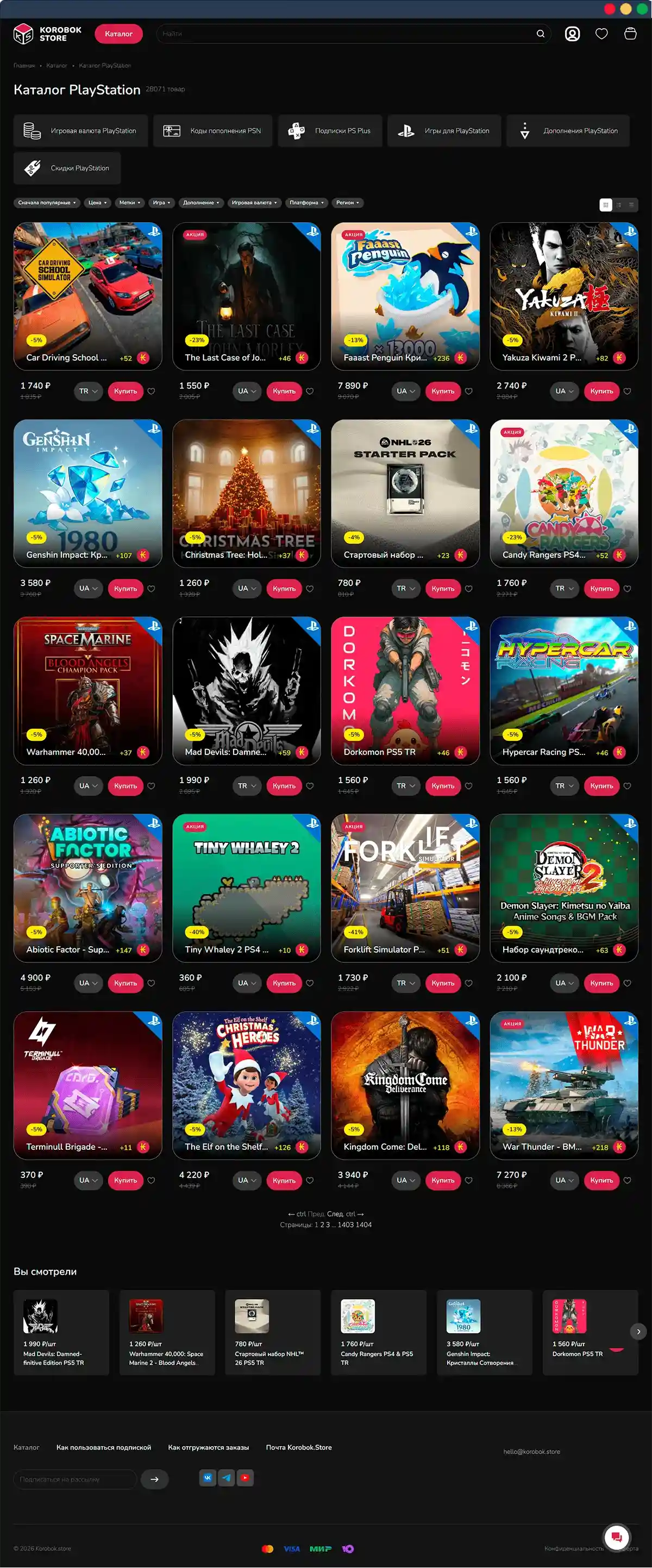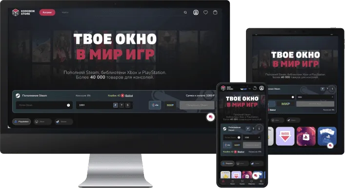 Korobok.store — платформа для приобретения видеоигр и пополнения кошелька Steam, PlayStation и Xbox. Функционал сайта оптимизирован для удобного поиска и покупки игр, а обширный каталог включает более 40 000 товаров для консолей.