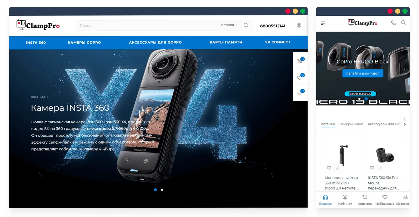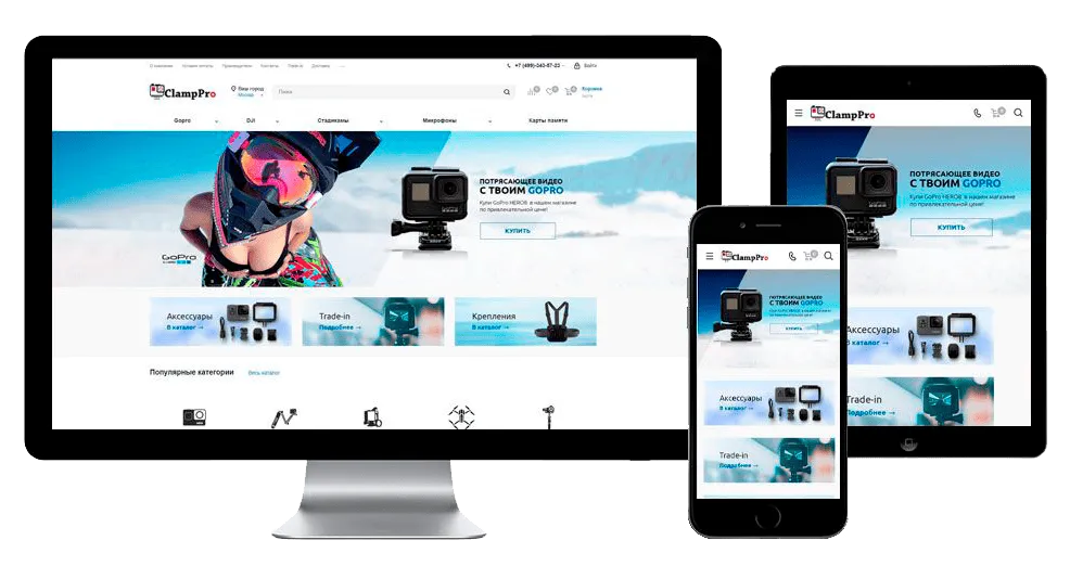 Интернет-магазин ClampPro предлагает широкий ассортимент камер GoPro и техники DJI, а также стедикамов, микрофонов и прочих аксессуаров для блогеров и экстремалов.